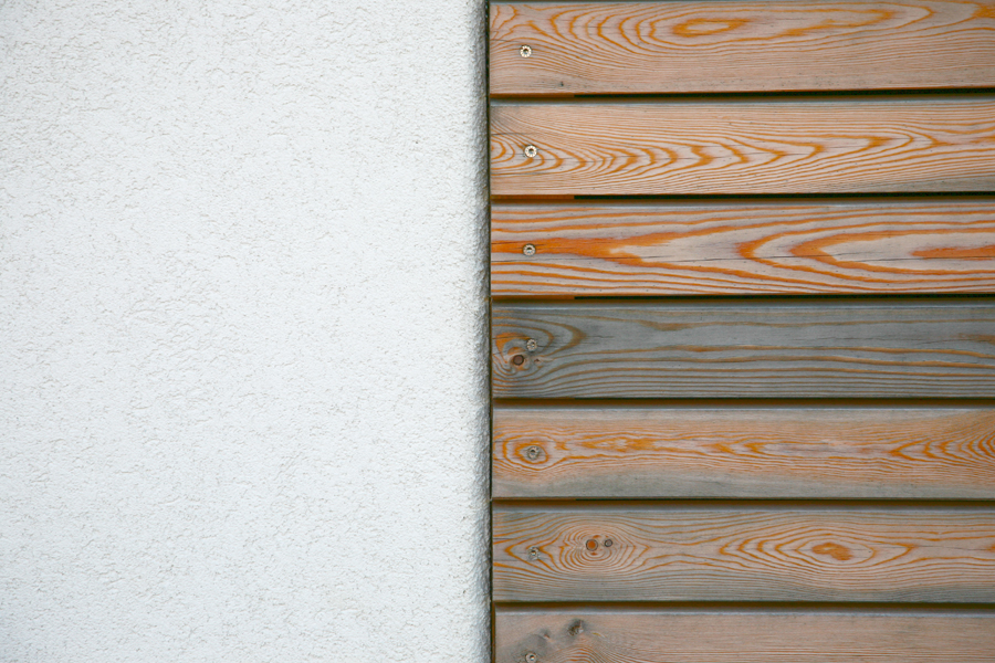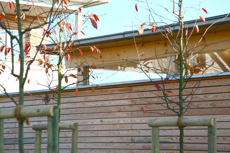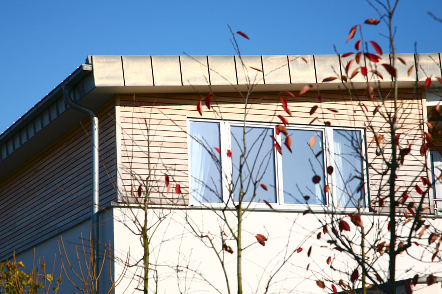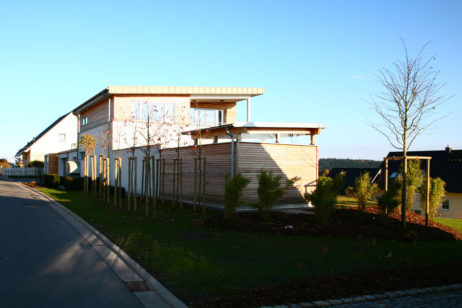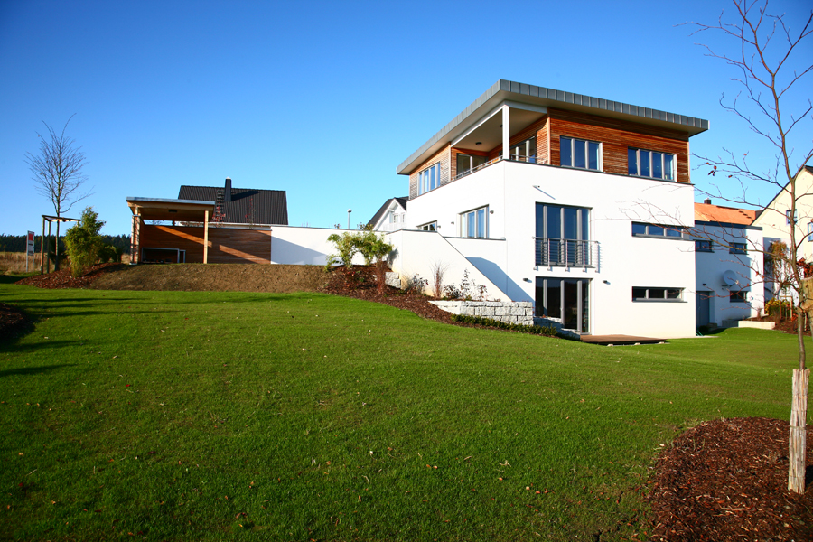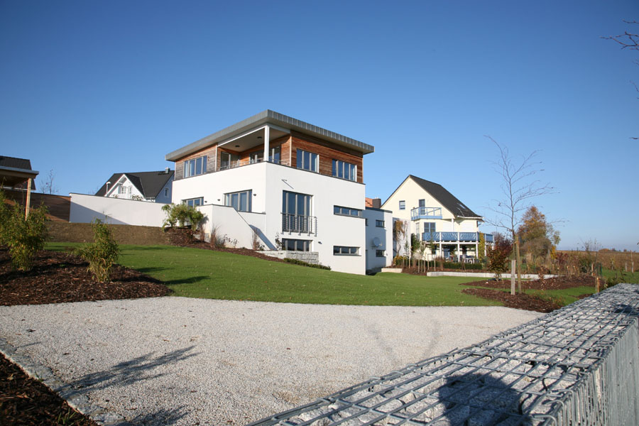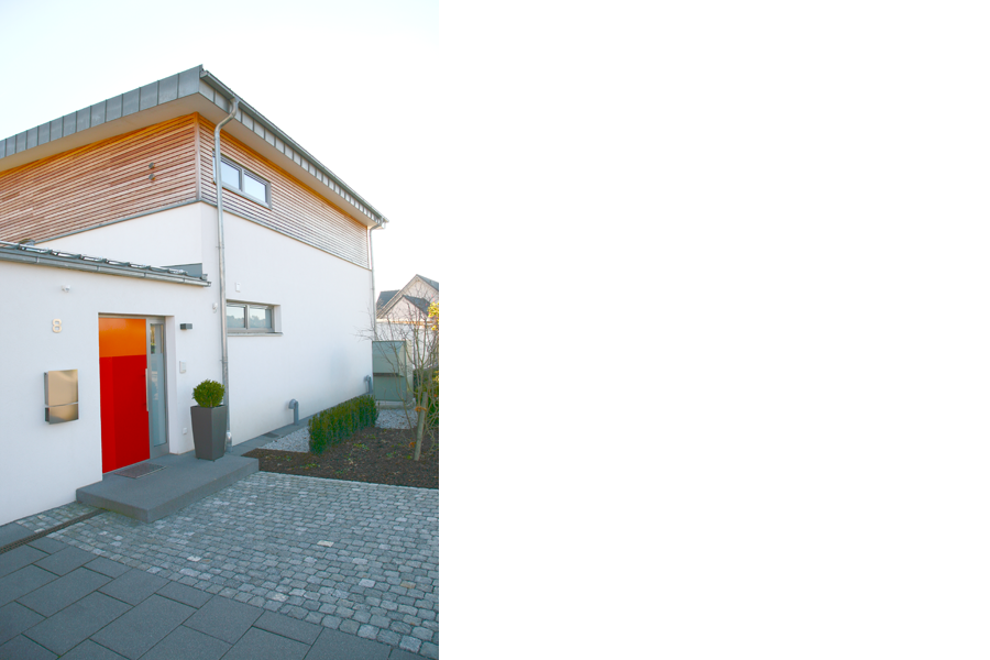 Für eine junge Familie war auf einem leichten Hanggrundstück ein Einfamilienhaus zu entwicklen. Das Treppenhaus sollte sich lichtdurchflutet zeigen und eine Wendeltreppe beherbergen und neben einer offenen Raumgestaltung von Wohnen, Essen und Küche galt es mehrere Räume wie Kinderzimmer, Bäder, Abstellräume etc. zu integrieren. Zwischen der Doppelgarage mit Flachdach und den Hauptgebäude ist der Eingang als Bindeglied integriert. Durch eine massive Wand wird das Areal nach Norden zur Straße hin abgegrenzt. Das Erdgeschoss beherbergt Küche, Wohn- und Essbereich als offener Raum, der nur durch die Möblierung abgegrenzt wird. Durch Glasschiebewände wird die vom Bauherren gewünschte Offenheit zum Treppenhaus erreicht, ohne die Nachteile (z.B. Zugerscheinungen aufgrund von Luftströmungen) in Kauf nehmen zu müssen. Auf der westlichen Seite des Hauses ist hier die große Terrasse angeordnet, von welcher man den Blick über den Garten und in die Ferne schweifen lassen kann. Im Obergeschoss sind die beiden Kinderzimmer mit einen eigenen Bad angeordnet. Gleichfalls ist den Kinderzimmern eine kleine Loggia angebunden. Im Untergeschoss befinden sich neben Schlafzimmer, mit vorgelagerter kleiner Terrasse, und Bad noch Technik- und Abstellräume. Das Treppenhaus wie auch der Zwischenbau ist an der östlichen Fassade durch große Rundfenster gegliedert.