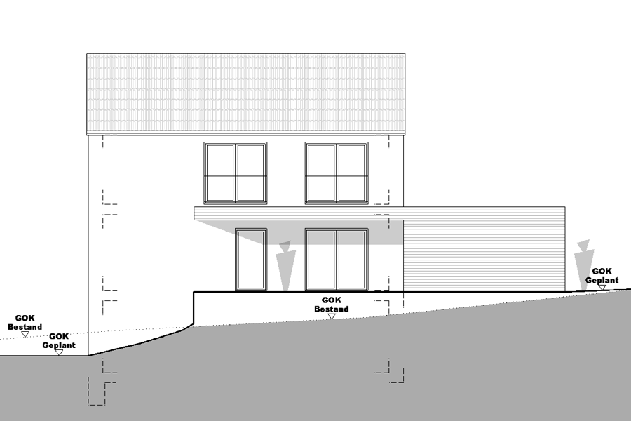 Die Bauherrschaft, ein junges Paar, beabsichtigte für sich ein Haus zu bauen. Idealerweise sollte, dem Wunsch der Bauherrin entsprechend, der Neubau (in der rechten Planhälfte) an das bestehende Elternhaus (linke Planhälfte) angebaut werden. Das ursächliche Problem für diesen Anbau ist der etwas problematisch gestaltete Altbau. Es muss eine Verbindung zwischen Neu und Alt geschaffen werden, ohne aber den Stil des Altbaus übernehmen zu müssen.