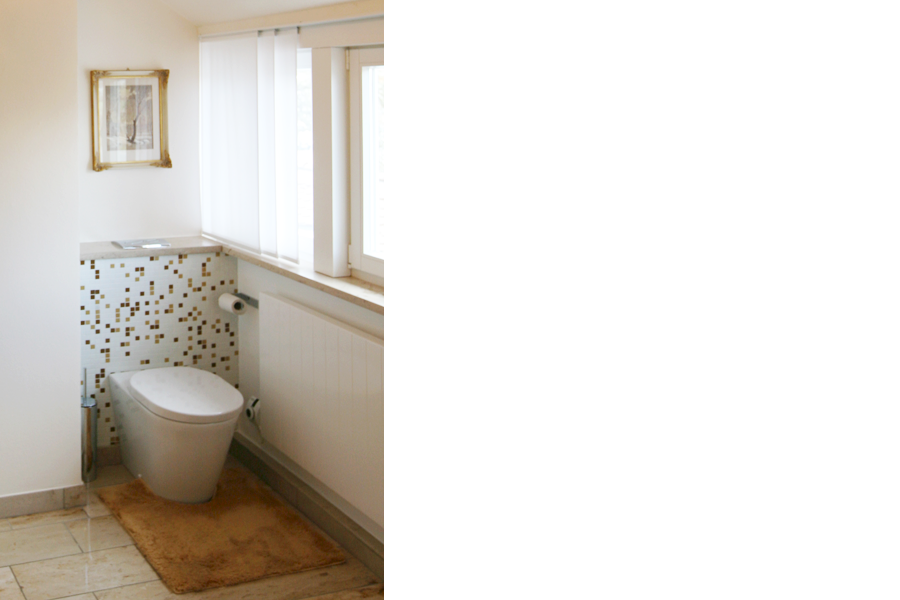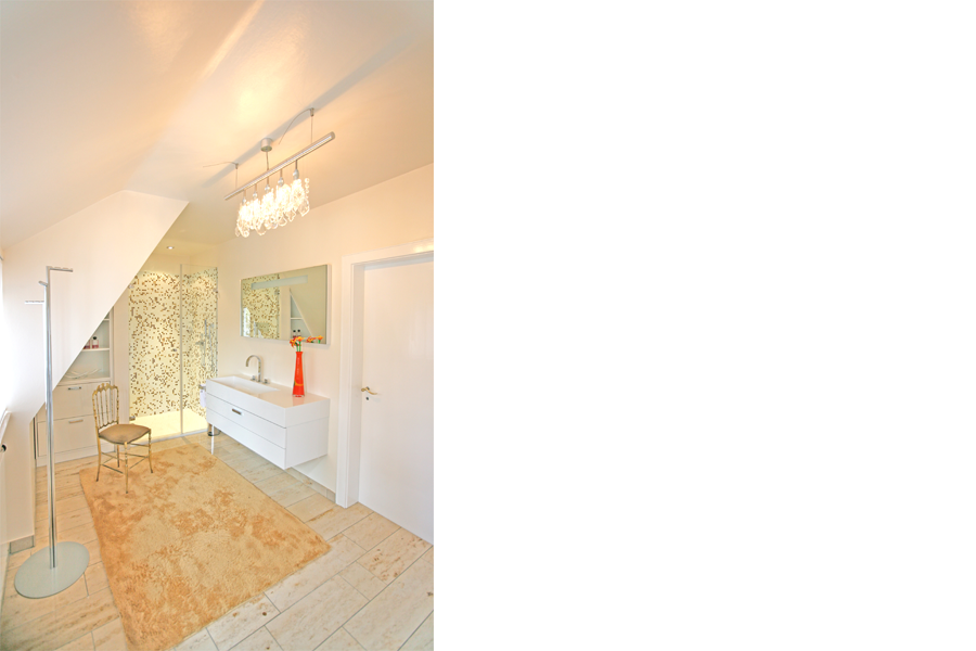 Das ursprünglich im 70-iger Jahre Look eingerichtete Badezimmer bedurfte aufgrund seines Alters einer vollständigen Erneuerung. So wurden Badewanne, Waschbecken und Toilette abgebrochen und durch aktuelle Sanitärgegenstände ersetzt. Anstelle der Badewanne wurde auch im Hinblick auf eine altersgerechte Gestaltung eine großräumige Dusche mit nahezu schwellenlosem Eingang eingebaut. Der Natursteinbodenbelag (Kalkstein) konnte aufgrund seines guten Zustandes erhalten bleiben und bedurfte lediglich einer neuen Abschliffs, nur im Bereich der ehemaligen Badewanne mußte ergänzt werden. Die Dusche und der Toilettenbereich erhielten einen Wandbelag aus Glasmosaik. In der Farbgestaltung des Bades wurden unterschiedlich abgestufte Brauntöne in Kombination mit weißen Möbeln und Sanitärgegenständen verwendet. Neben einem Kristallleuchter wird das Konzept durch mehrere Details wie ein kleines Gemälde oder eine orange Glasvase abgerundet.