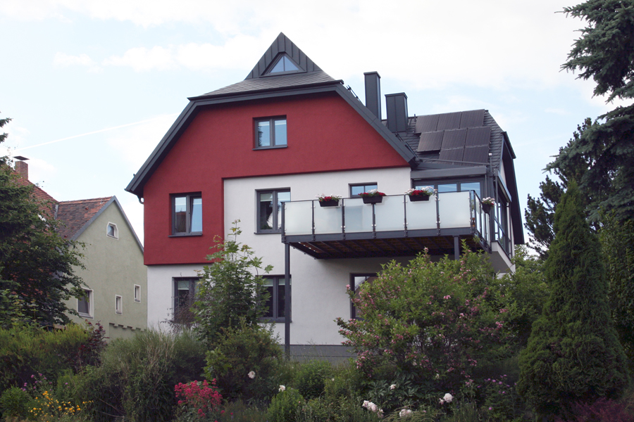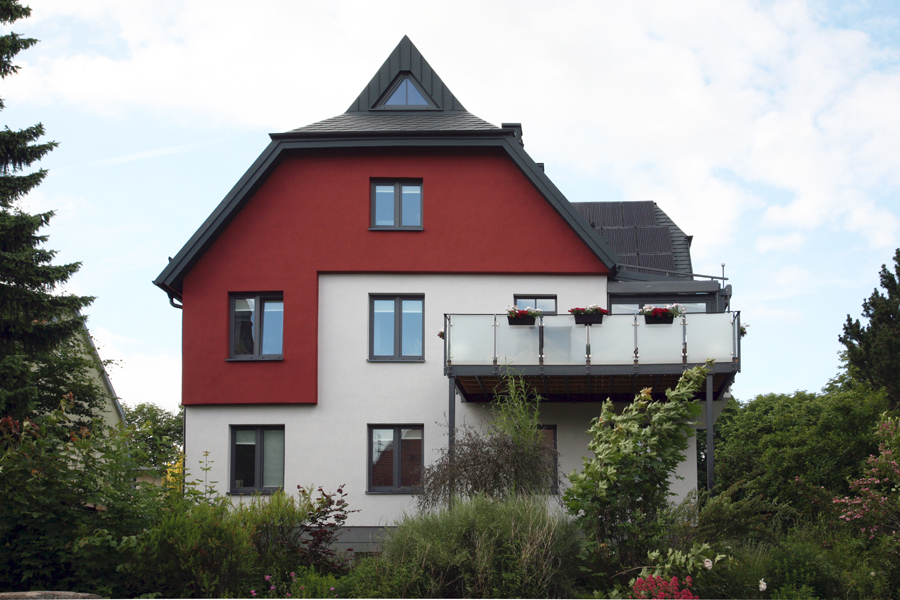 Das gründerzeitliche Mehrfamilienwohnhaus wurde bereits einmal um die 60-iger Jahre herum umgebaut. Dieser Stand entsprach nicht dem zeitgenössischem Wohnen, ebenso so wenig wie dem aktuellen energetischen Standard. Daher wurde das Gebäude vollständig mit einem mineralischen Wärmedämmverbundsystem verkleidet, die Fenster wurden durch Kunststofffenster mit 3-fach-Isolierverglasung erneuert, das Dach erhielt eine Aufdachdämmung und eine neue Eindeckung. In diesem Zuge wurde auch die Heizungsanlage gegen eine kleines Blockheizkraftwerk ausgetauscht. Die maroden Fertiggaragen wurden abgebrochen und an deren Stelle eine neue Doppelgarage mit angeschlossenem Gartengeräteraum errichtet.