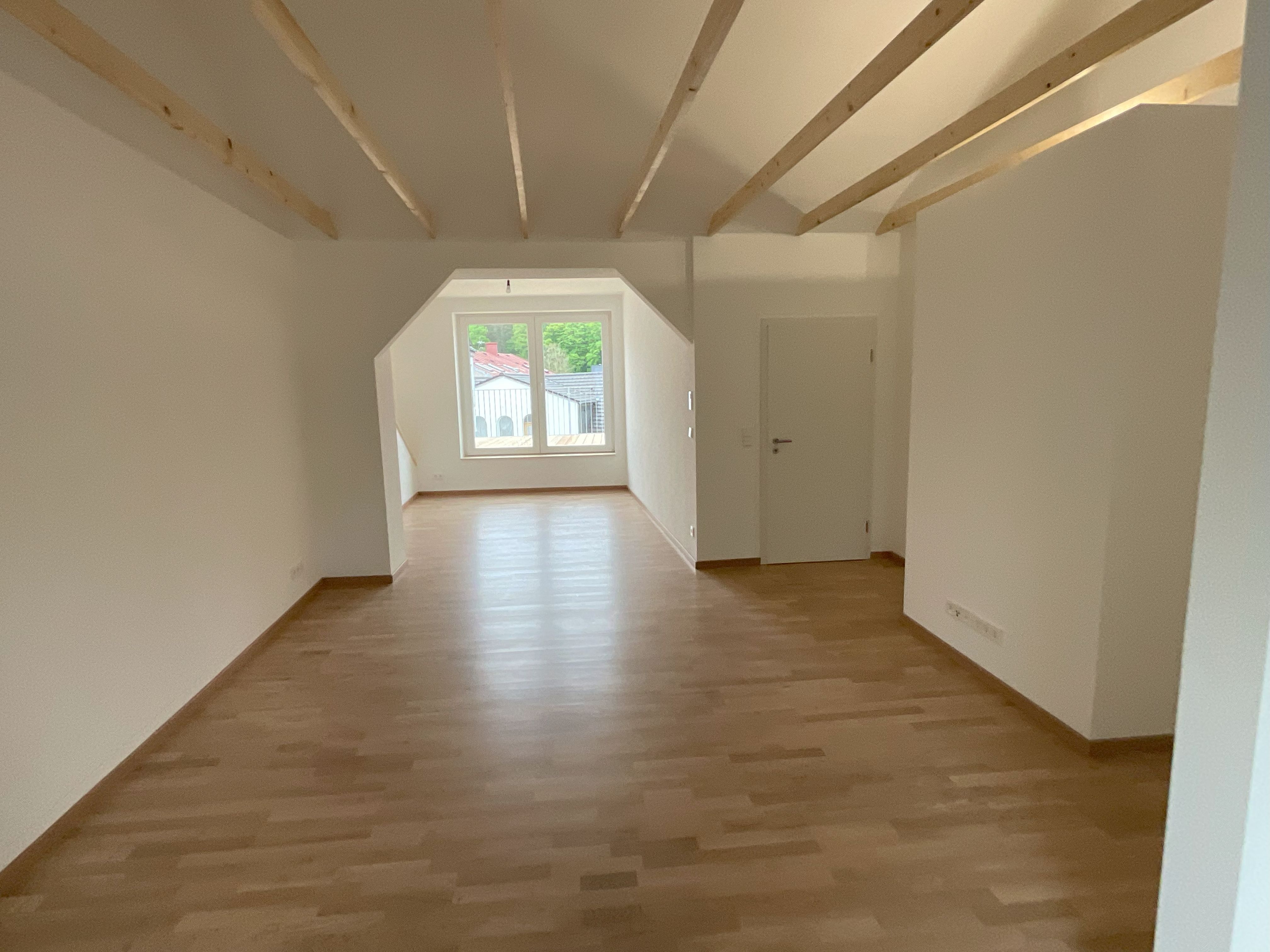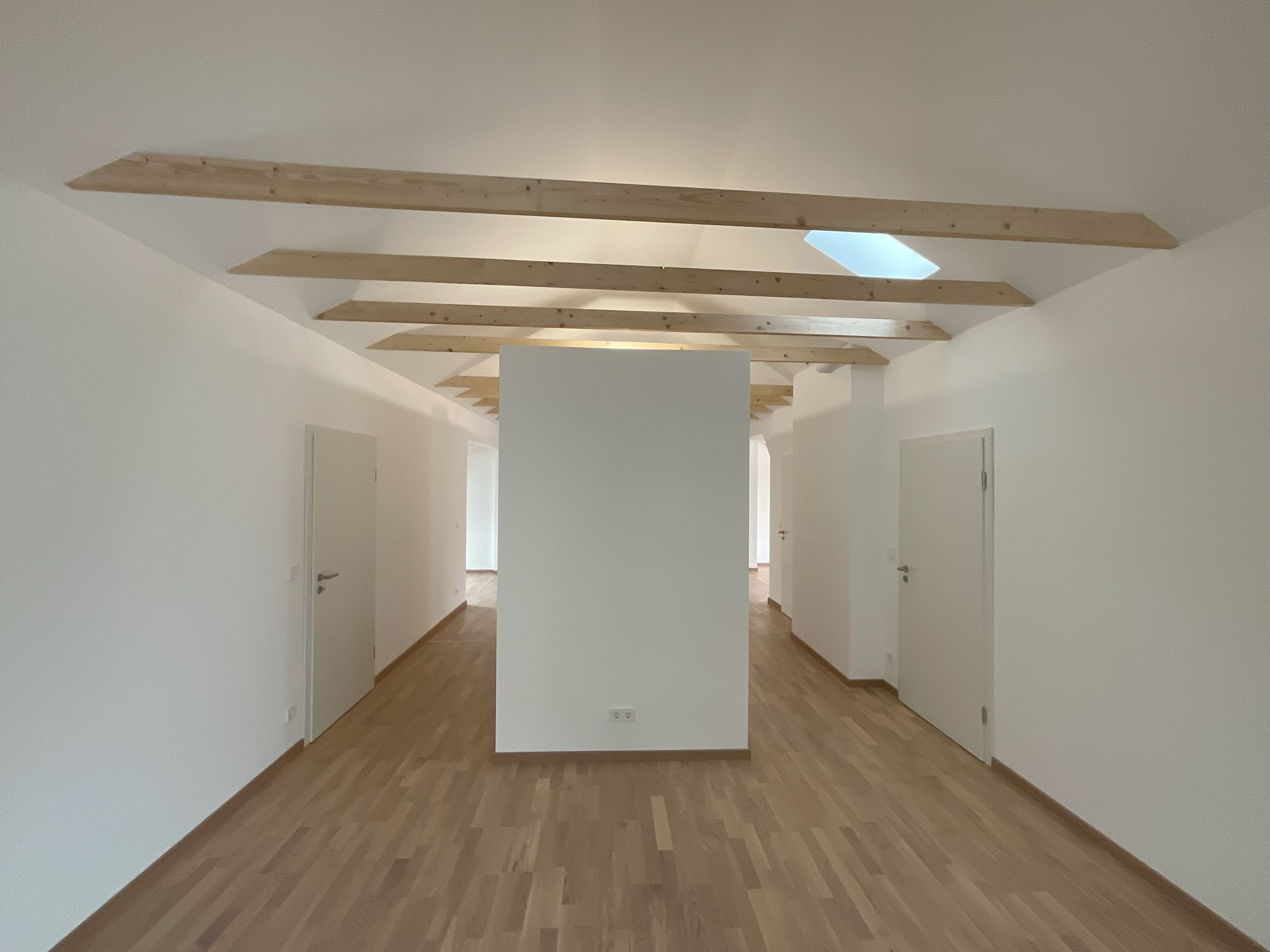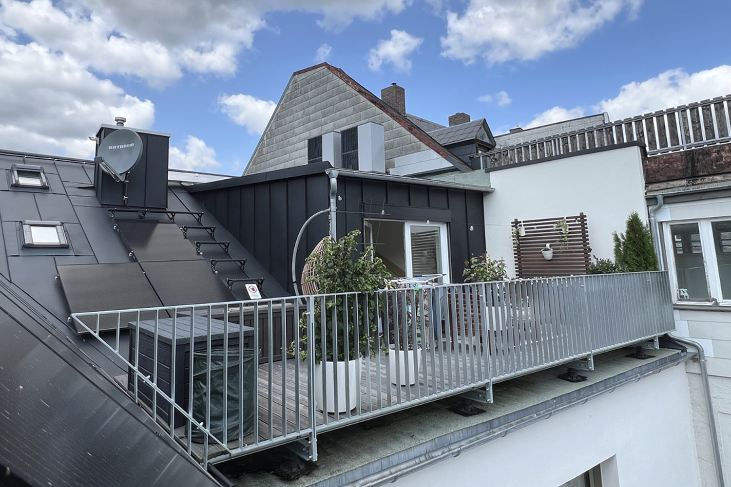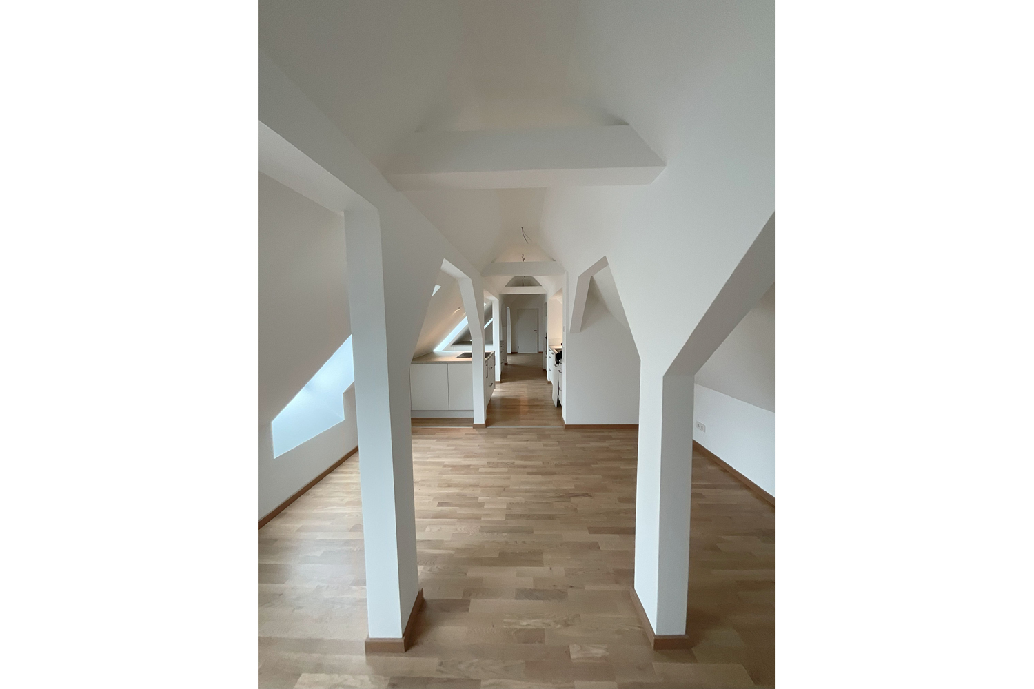 Der vorhandene Dachstuhl konnte beibehalten werden. Für die neue Nutzung als Dachgeschosswohnung mussten ein paar Ertüchtigungsmaßnahmen des Dachstuhls und ein paar Ergänzungen wie Dachflächenfenster, die große Dachgaube und einen rückwärtigen Ausgang auf die Dachterrasse durchgeführt werden.