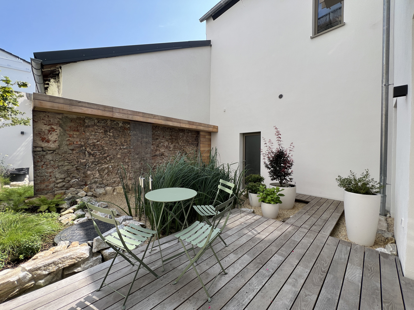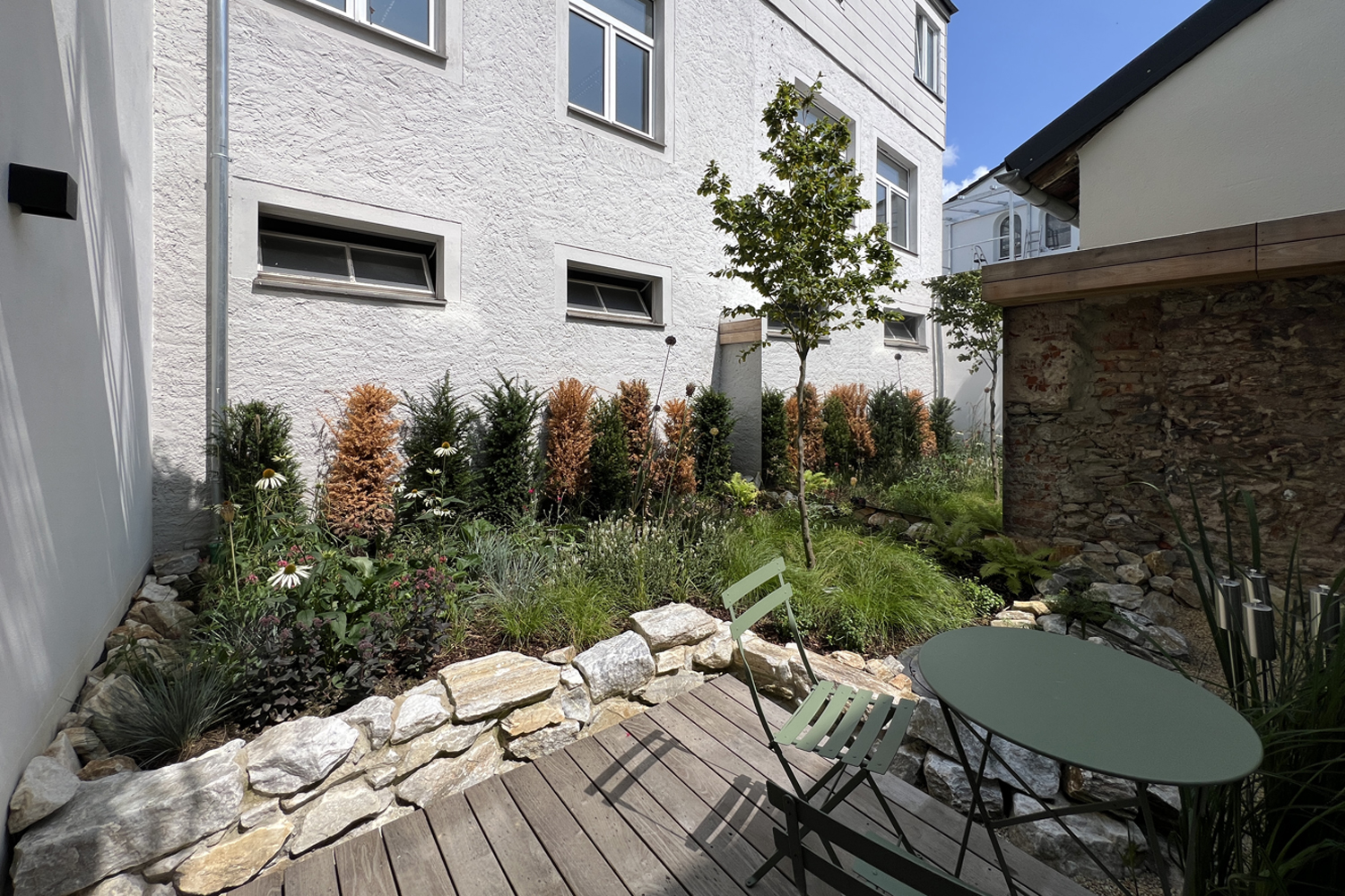 Der vorhandenen kleine Innenhof wurde von Nebengebäuden beräumt und komplett entsiegelt. Hier konnte für ene Einheit ein begrünter Innenhof mit Terasse geschaffen werden.