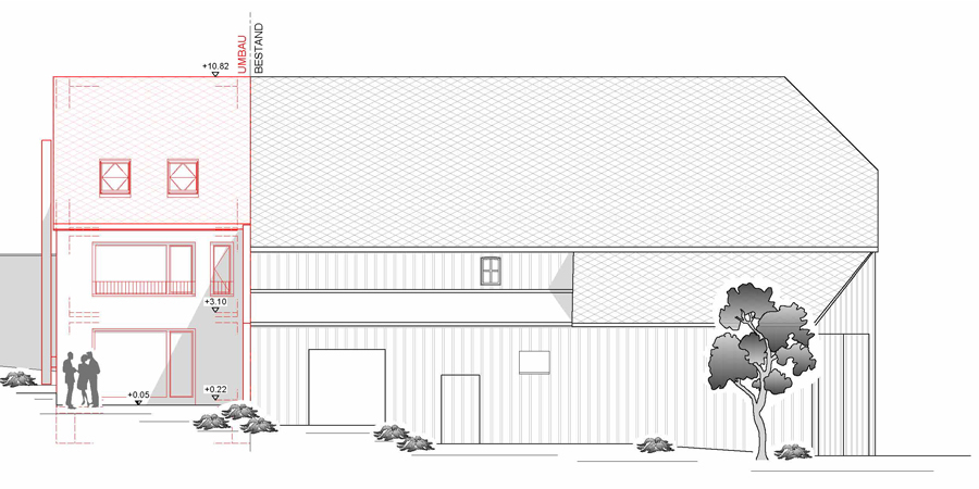 Die Aufgabe bestand darin, dass der Bauherr aus seiner bisherigen zu großen Wohnung auf dem Gehöft in eine kleinere Wohnung auf dem grundstück umziehen wollte, um für die Familien der Kinder Platz zu machen. Nachdem die vorhandene Schuene in Teilen baufällig war, wurde beschlossen, diesen Teil zu einer Wohnung umzugestalten.
